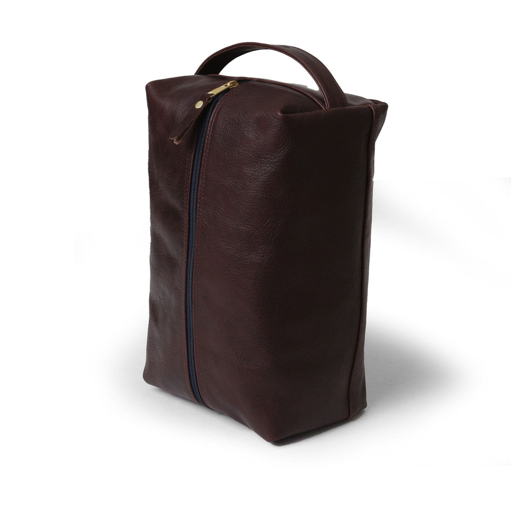 Built for the traveling golfer and made to keep your game day spikes looking sharp at home and on the road. A classic design combines our handsome espresso leather with brass zippers and splash proof liner. Center zip design for wide mouth access. Make it personal with a custom embroidered monogram or club logo.