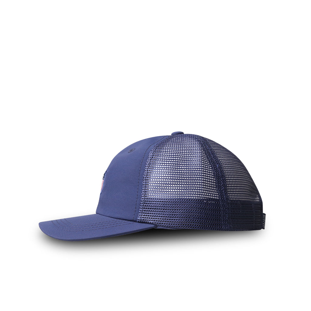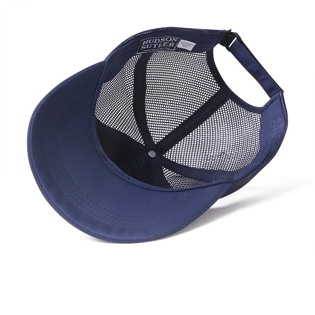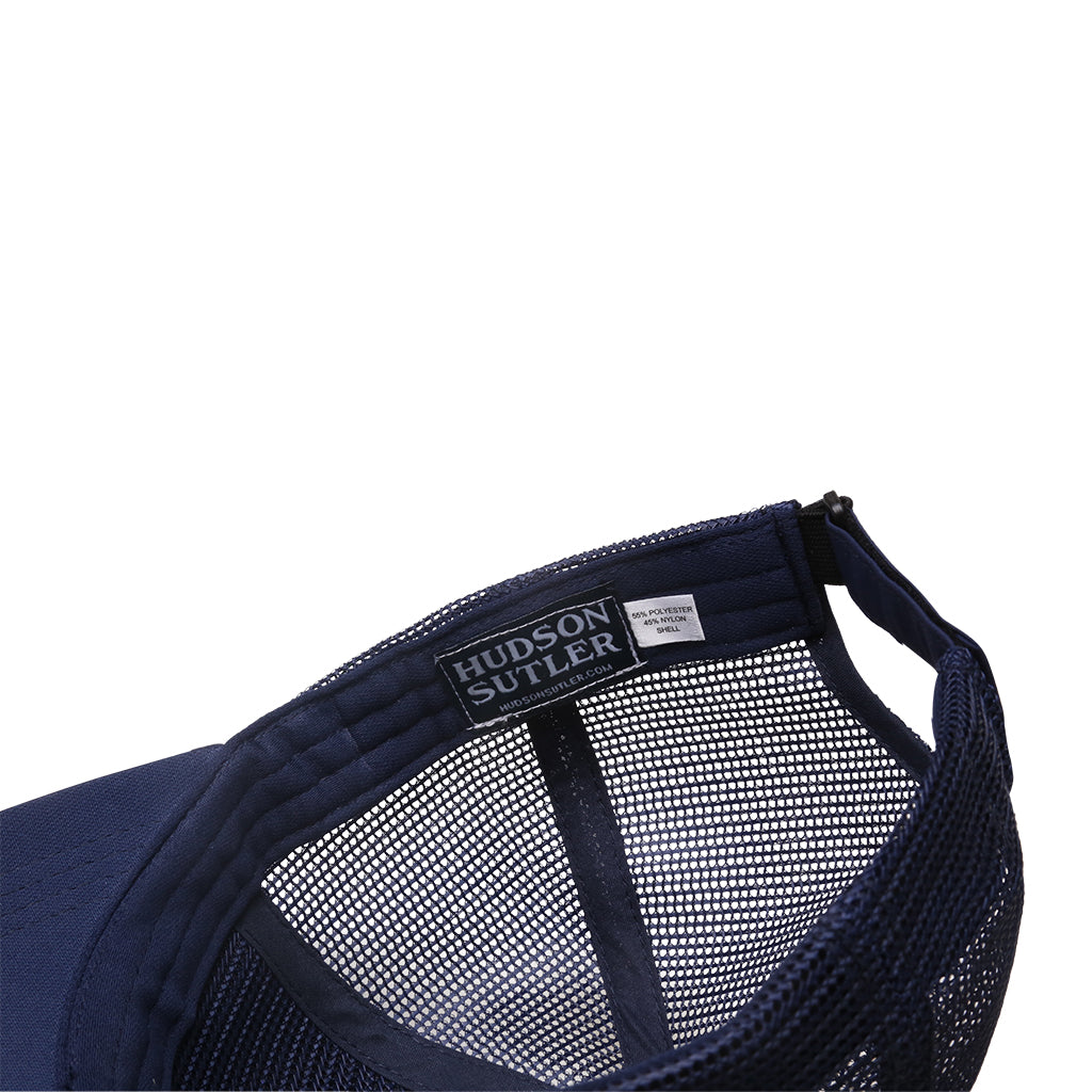 The most comfortable hat you will own. Our performance trucker hats are crafted from Navy Blue durable, water repellant nylon taslon, similar to what you would feel on a pair of your old favorite board shorts, trucker mesh back and a stretch velcro strap. We've added a a quilted performance antimicrobial sweatband and under visor making this the perfect lid for mid summer beach day or morning workout without the sweat marks. A water-repellent, navy blue trucker cap built for all day comfort.